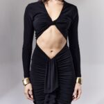The Maha dress features a cut-out detail at the front and a draped panel below. This design is finished with a plunging neckline and gathered detailing.
