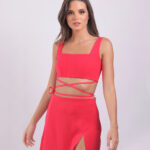 High waisted skirt made of double crepes with a slit at the front and zipped at the side. No lining.